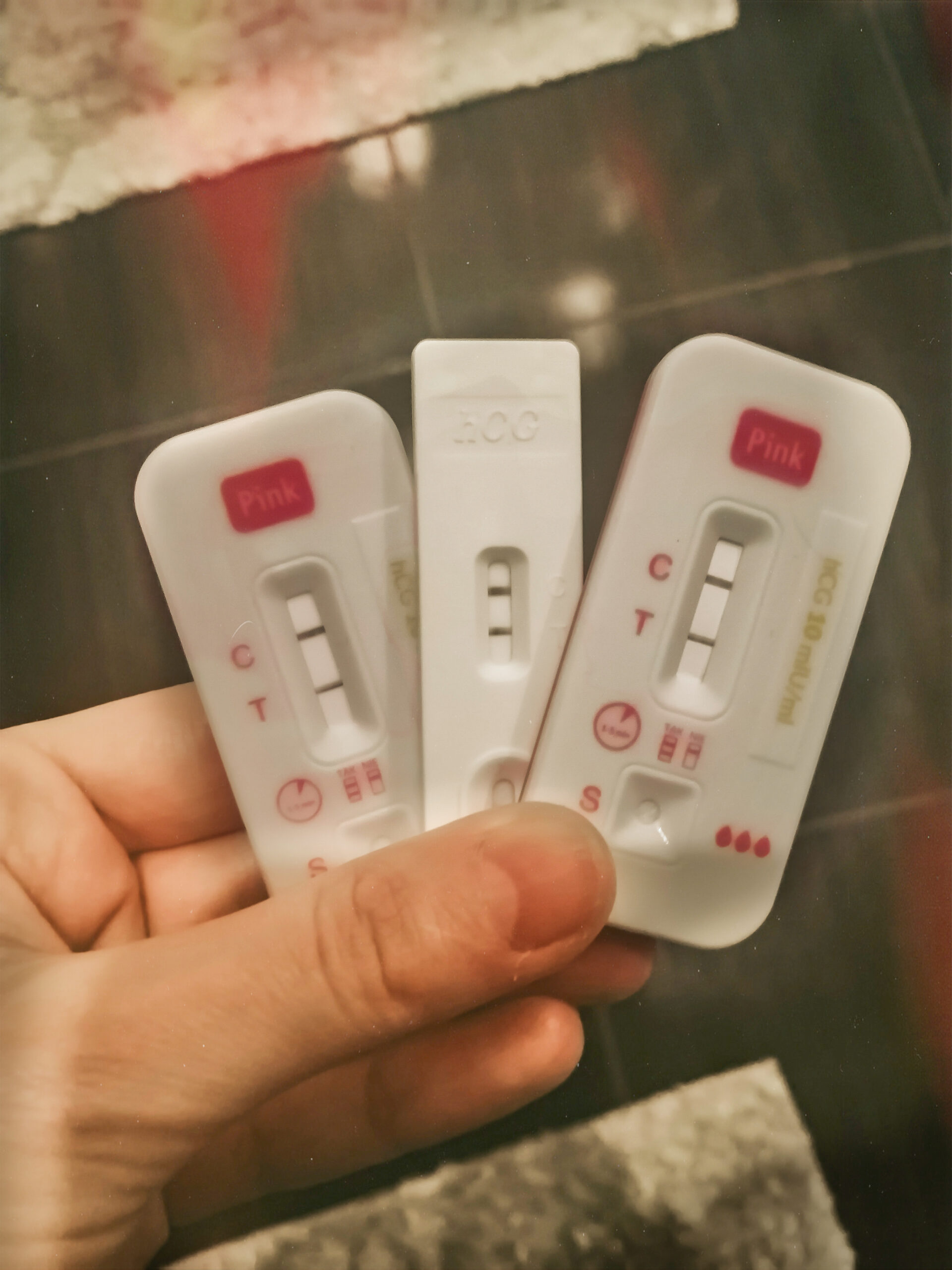 Wróciłam do gabinetu, po tym cyklu, dostałam lamette na owulację. Po kilku dniach znowu wizyta. Piękny pęcherzyk owulacyjny. Kolejna recepta na zastrzyk na pęknięcie pęcherzyka. Zastrzyk kupiony, zjeździliśmy kilka aptek, bo „produkt deficytowy”. Po obiedzie zrobiłam zastrzyk. Czekamy i działamy. Czekamy.. 26 marca pojechaliśmy do teścia, zbliżały się Święta Wielkanocne, które spędzaliśmy u moich rodziców, więc tydzień przed postanowiliśmy pojechać odwiedzić rodzinę męża. Byłam na 2 dni przed okresem. W poniedziałek miałam dostać okresu, tak wynikało z kalendarzyka, ale wiadomo jak to u mnie. W terminie to nigdy nie było, nawet po duphastonie.. Pojechaliśmy z mężem na zakupy. Stwierdziliśmy, że trzeba kupić test, bo zawsze, gdy robiłam test to następnego dnia przychodził okres. Jak pomyśleliśmy, tak zrobiliśmy. Mąż jadł obiad a ja w łazience robiłam test. Siedząc na kibelku przeglądałam na telefonie jakieś głupoty. Obróciłam głowę od niechcenia i nagle zobaczyłam coś, na co czekałam od 1,5 roku. II kreski. Dwie grube, różowe krechy! zawołałam męża nie wierzyliśmy. w zapasie miałam jeszcze jeden test, przeznaczony na rano. Zrobiłam od razu. Znowu II kreski! Szok, łzy, niedowierzanie. Była godzina 17.18 =, chwilę później byliśmy w drodze do laboratorium otwartego do 18, jedynego do którego zdążylibyśmy dojechać. Dojechaliśmy.